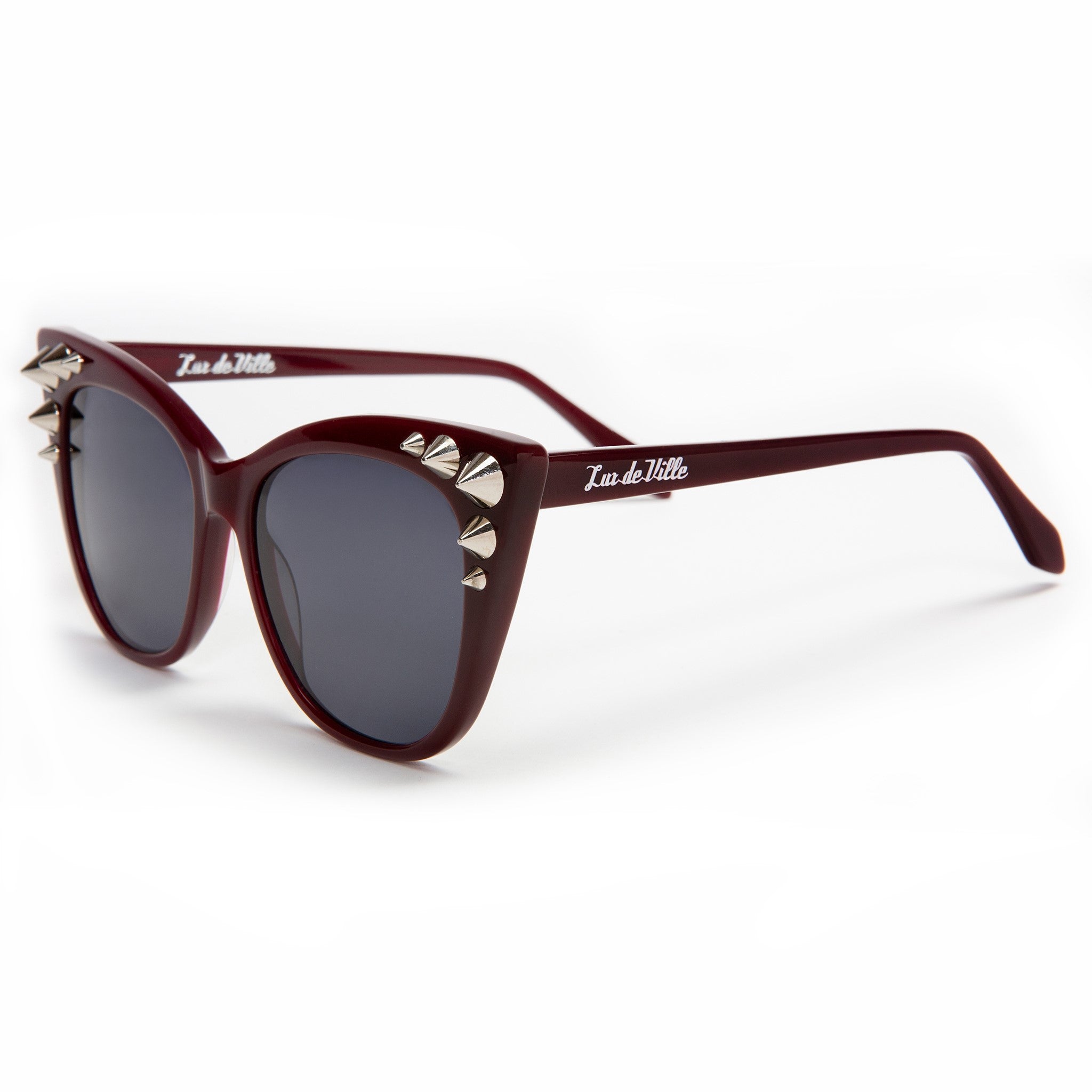 Our Roxanne glasses are for our pretty punk girls. Shown here in red, they are hand crafted in top notch acetate of course These classic cat eye glasses feature over sized studded details and our chrome logo plates on the arms. A modern retro twist with a perfect fit! You're gonna look fabulous!!