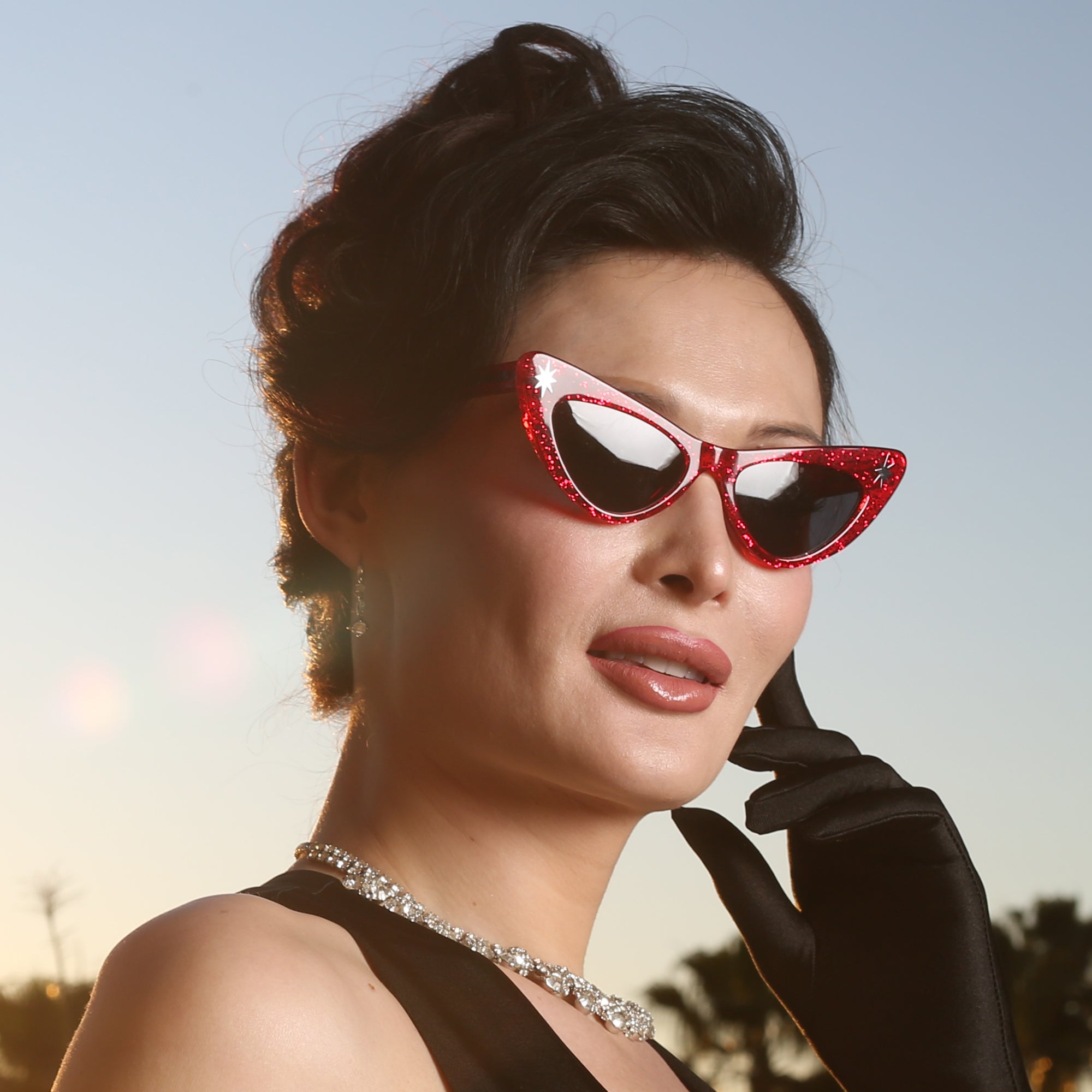 Our Starlite glasses are classic vintage reproduction frames adorned with our iconic starlite chrome hardware. Hand crafted top notch acetate frames with our chrome logo plate on the arms. Shown here in red rum sparkle these gorgeous frames are waiting for a midnight car cruise! You're gonna look fabulous!