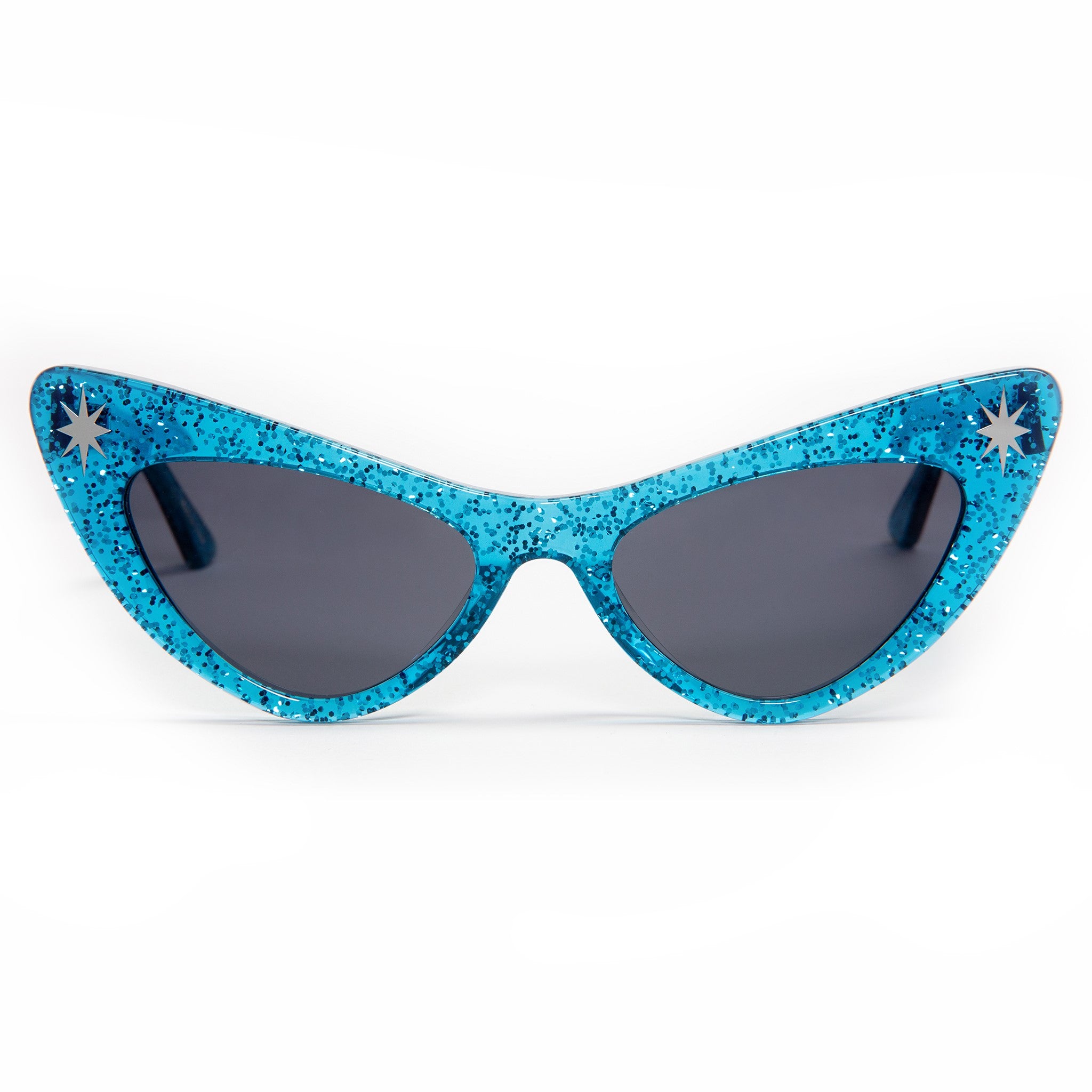 Our Starlite glasses are classic vintage reproduction frames adorned with our iconic starlite chrome hardware. Hand crafted top notch acetate frames with our chrome logo plate on the arms. Shown here in villain blue sparkle these gorgeous frames are waiting for a midnight car cruise! You're gonna look fabulous!