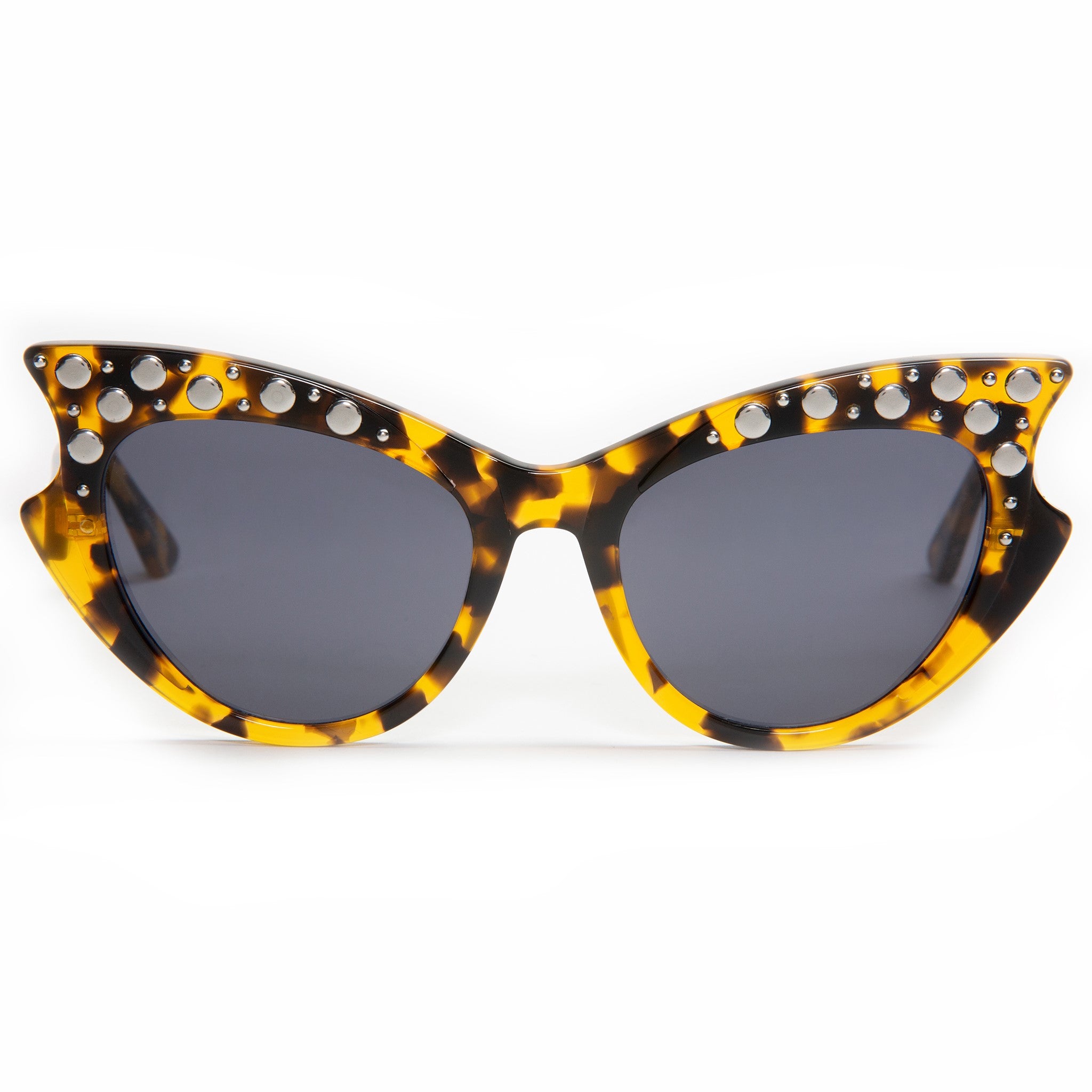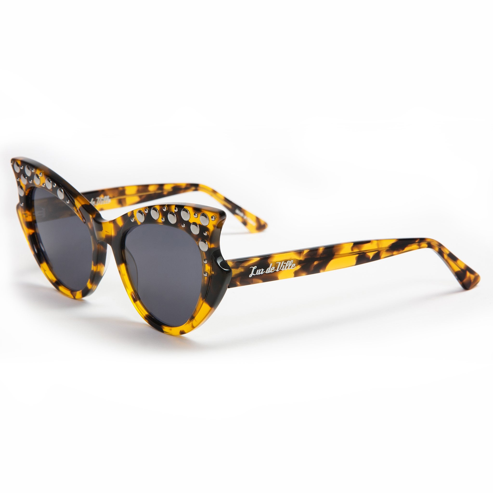 Vamp it up! These vintage reproduction studded frames are for that Lux lady looking for something spooky and sexy! Hand crafted out of top notch acetate of course. Shown here in black gloss with our chrome logo plate on the arms these beauties have that perfect fit! You're gonna look fabulous!